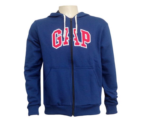 Blusa Moletom GAP Azul Marinho - Confeccionado em tecido 77% algodão e 23% poliéster. Modelo com capuz, cordão para ajuste e zíper frontal, bolsos frontais estilo canguru, Logotipo da marca na parte Frontal com contorno bordado. Possui duas etiquetas de autenticidade, sendo uma na gola e uma em TAG.